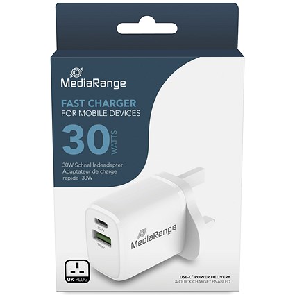 MediaRange Fast Charging Adapter for Mobile Devices, 30W UK Plug, White